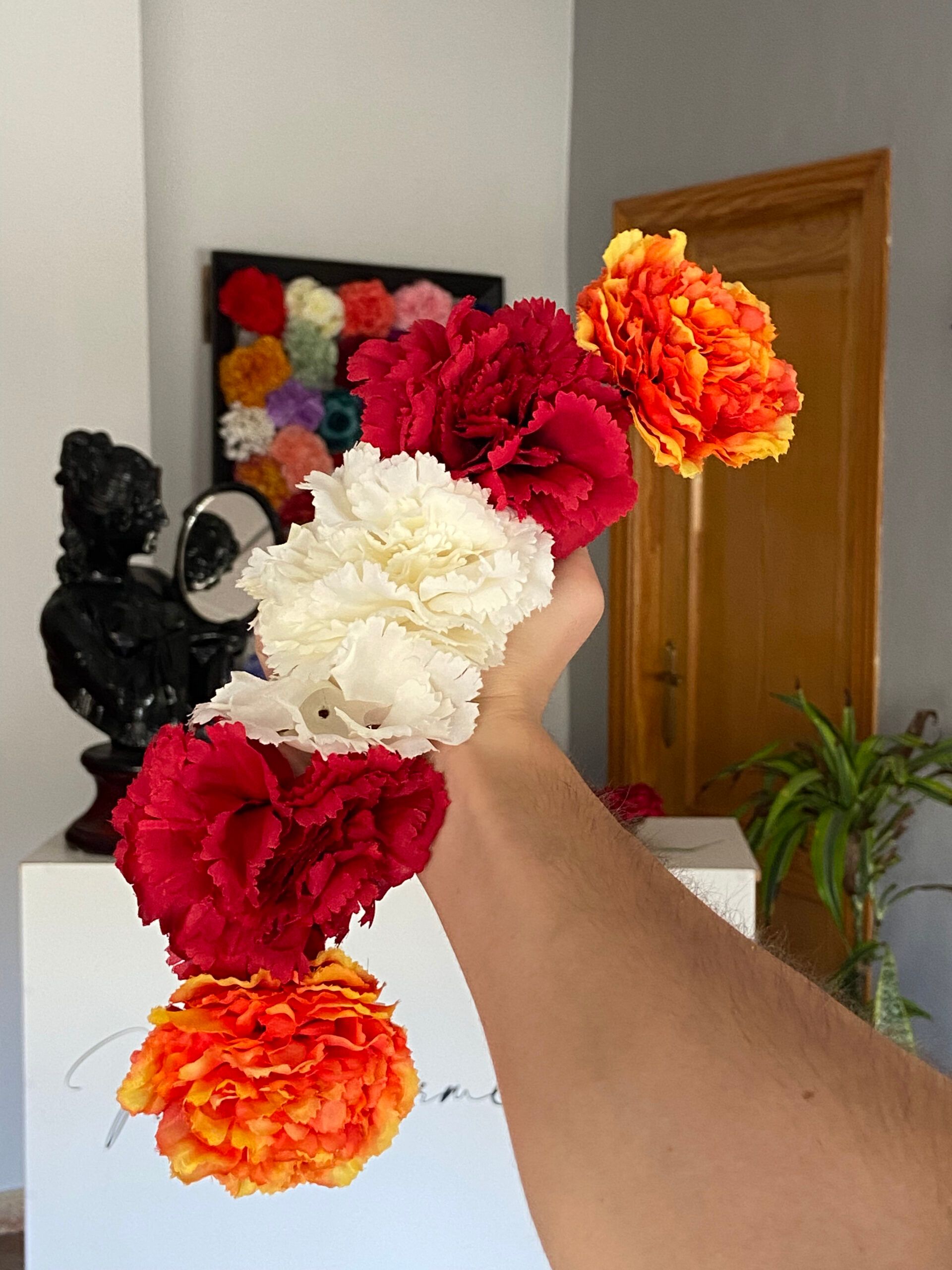 Cada diadema está confeccionada con claveles artificiales de alta calidad, imitando la apariencia y textura de las flores naturales. La atención al detalle asegura que cada flor tenga una presencia vibrante y atractiva, convirtiéndola en un accesorio esencial para cualquier atuendo flamenco.