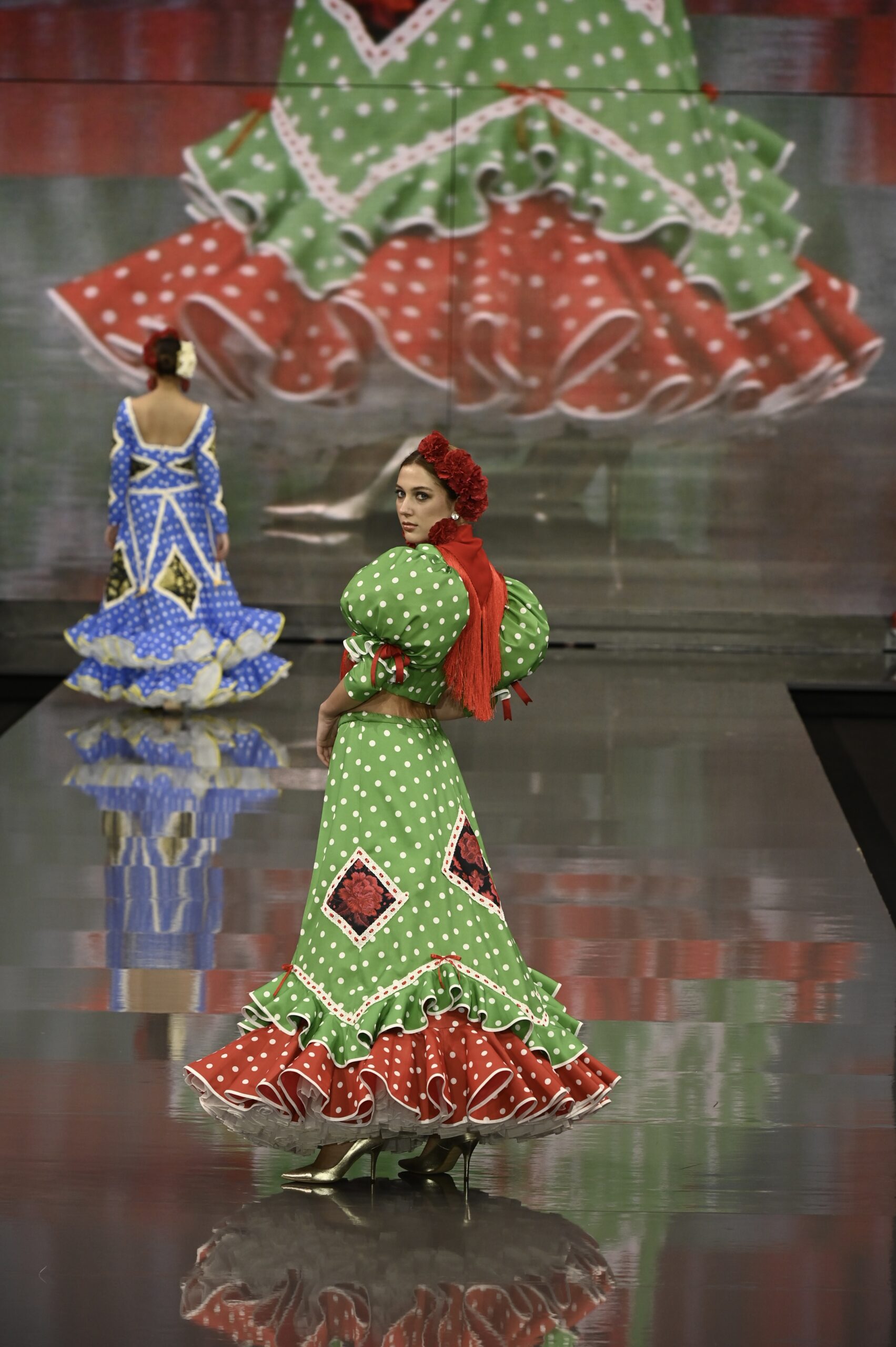 Vestido de flamenca de la colecciĂ³n Leyenda del Tiempo. Este traje de flamenca estĂ¡ Diseñador por Vela D´Cobos y hecho a mano por Mari Carmen SĂ¡ez. Forma parte de una colecciĂ³n que ha desfilado desde en las pasarelas de JaĂ©n hasta en SIMOF 2022 Descubre la elegancia en su mĂ¡xima expresiĂ³n con nuestro traje de dos piezas verde con lunares blancos y detalles en rojo. Una obra maestra que combina la tradiciĂ³n flamenca con un toque moderno.