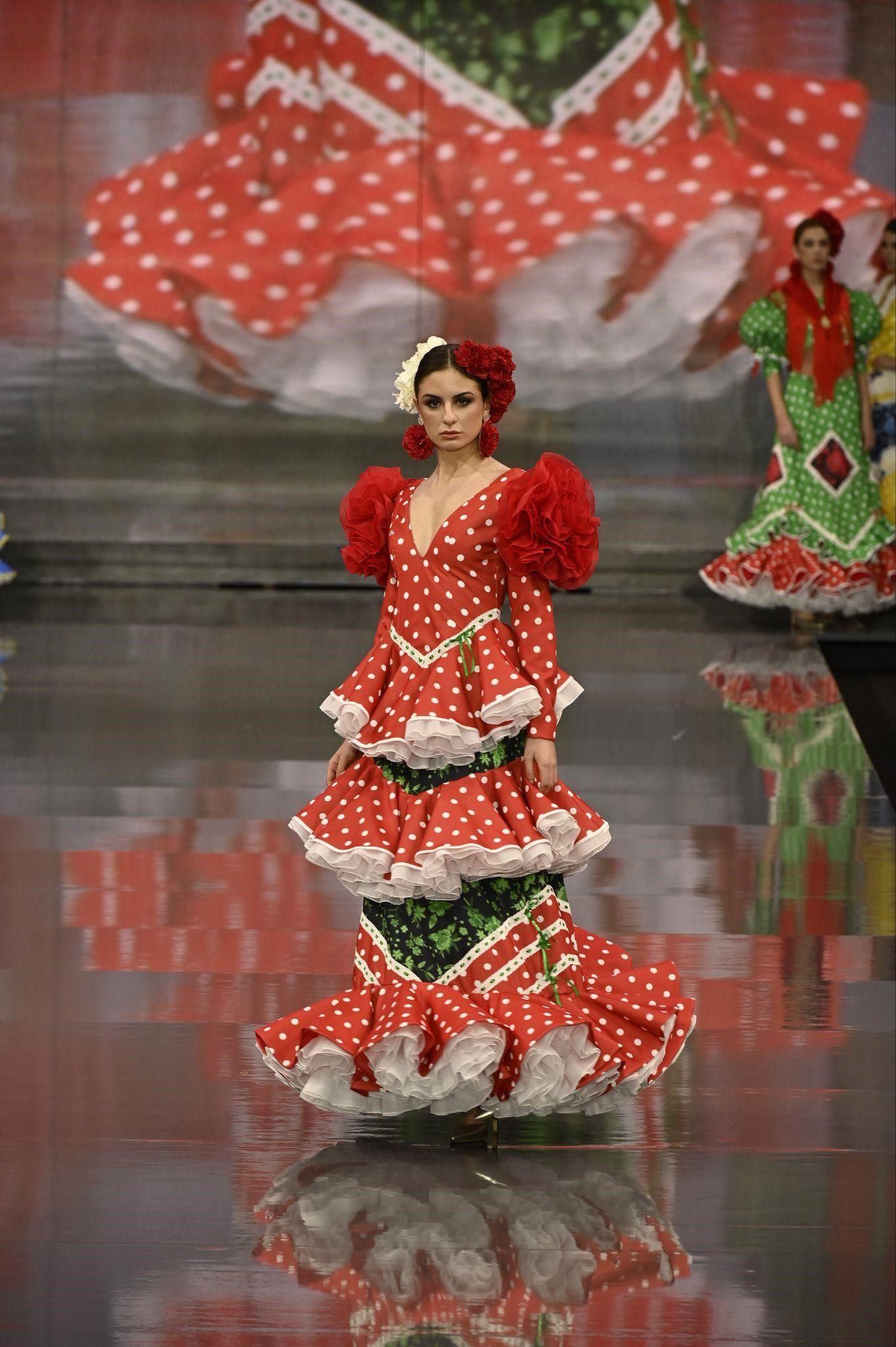 Este vestido está hecho a mano, asegurando que cada detalle sea meticulosamente cuidado. Los volantes en capas y los adornos están confeccionados con precisión para añadir volumen y movimiento, creando una prenda que celebra la elegancia flamenca con un toque contemporáneo.